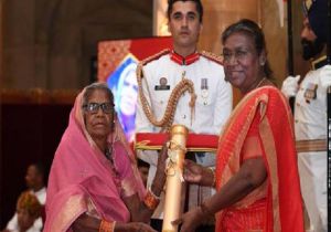राष्ट्रपति श्रीमती मुर्मु ने बैगा चित्रकार श्रीमती जोधइया बाई बैगा को पद्मश्री पुरस्कार प्रदान किया