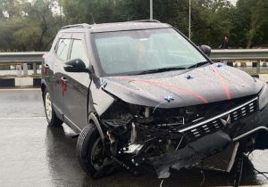 निवाड़ी तिगेला कृषि उपज मंडी के पास सड़क पर पानी भरने से डिवाइडर से कार टकरा कर हुई क्षतिग्रस्त