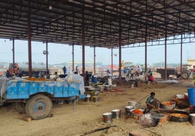 भंडारे में सीमेंट-कंक्रीट मिक्सर वाली मशीन में बने मालपुए