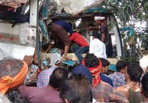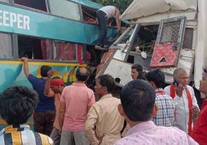 स्टेट हाईवे पर कंटेनर और यात्री बस की भिड़ंत, तीन की मौत, पांच की हालत गंभीर