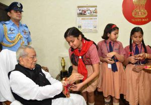बाल ग्राम और स्कूल की बालिकाओं ने राज्यपाल हरिचंदन को बांधी राखी