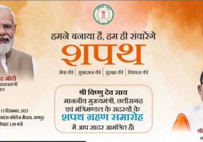 प्रधानमंत्री नरेन्द्र मोदी की गरिमामय उपस्थिति में छत्तीसगढ़ के नए मुख्यमंत्री विष्णु देव साय और मंत्रिमंडल के सदस्य 13 दिसम्बर को लेंगे शपथ