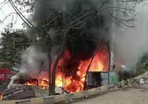 थाने के बाहर धू-धू कर जली 15 कारें व 60 दोपहिया वाहन