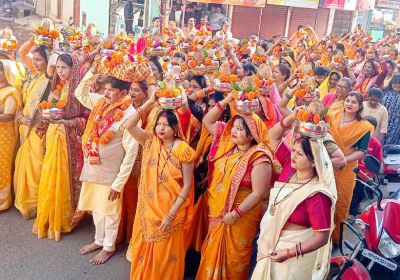 51 कलश सिर पर लेकर चलीं महिलाएं, जमकर थिरकें श्रद्धालु