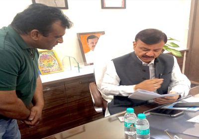 मध्य प्रदेश शासन के परिवहन मंत्री से महेश सिनकर चर्चा करते हुए