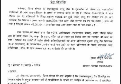9 Jan, 2025 08:02 PM IST | SAMWADINDIA.INभोपाल कलेक्टर कौशलेन्द्र विक्रम सिंह के निर्देशानुसार घरेलू गैस सिलेण्डरों के दुरुपयोग को रोकने हेतु खाद्य...