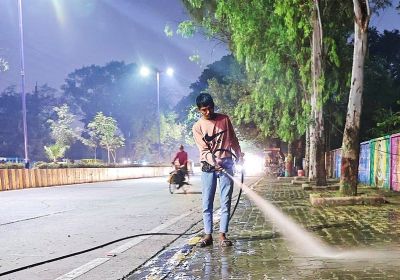 इंदौर में रात के समय शहर की सड़कों और स्थानों को साफ किया जा रहा