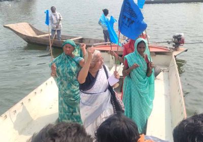 नर्मदा नदी में भव्य नाव रैली, मेधा पाटकर ने बीच पानी में मछुआरों के अधिकारों का मुद्दा उठाया