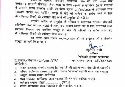4 Feb, 2026 02:11 PM IST | SAMWADINDIA.INरायपुर. राज्य सहकारी विपणन संघ मर्यादित बोर्ड की शक्तियों का प्रयोग करने शशिकांत द्विवेदी को प्राधिकृत...