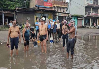 जलभराव और गड्ढों से परेशान व्यापारी, अनूठे अंदाज़ में जताया आक्रोश