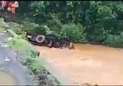 नदी में तेज बहाव के बीच नदी में पलटा ट्रक, चालक, परिचालक सहित बाल-बाल बचे 5 लोग