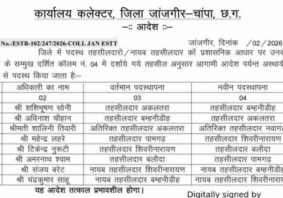 जांजगीर-चांपा जिले में पदस्थ तहसीलदार, नायब तहसीलदारों का नवीन पदस्थापना