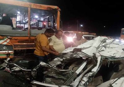 आगरा-मथुरा हाईवे पर मेटाडोर और रोडवेज के बीच पिस गई कार, दो लोगों की दर्दनाक मौत