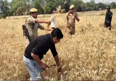 हमीरपुर : जिलाधिकारी घनश्याम मीणा ने खेत में काटी गेहूं की फसल