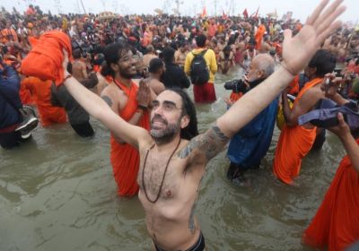 भारत की सनातन संस्कृति से अभिभूत विदेशी नागरिकों ने परिवार के साथ महाकुंभ पहुंचकर गंगा स्नान किया
