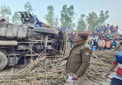 लखीमपुर खीरी में धौरहरा-सिसैया मार्ग पर सड़क किनारे खड़े बच्चों पर पलटा गन्ने से भरा ट्रक
