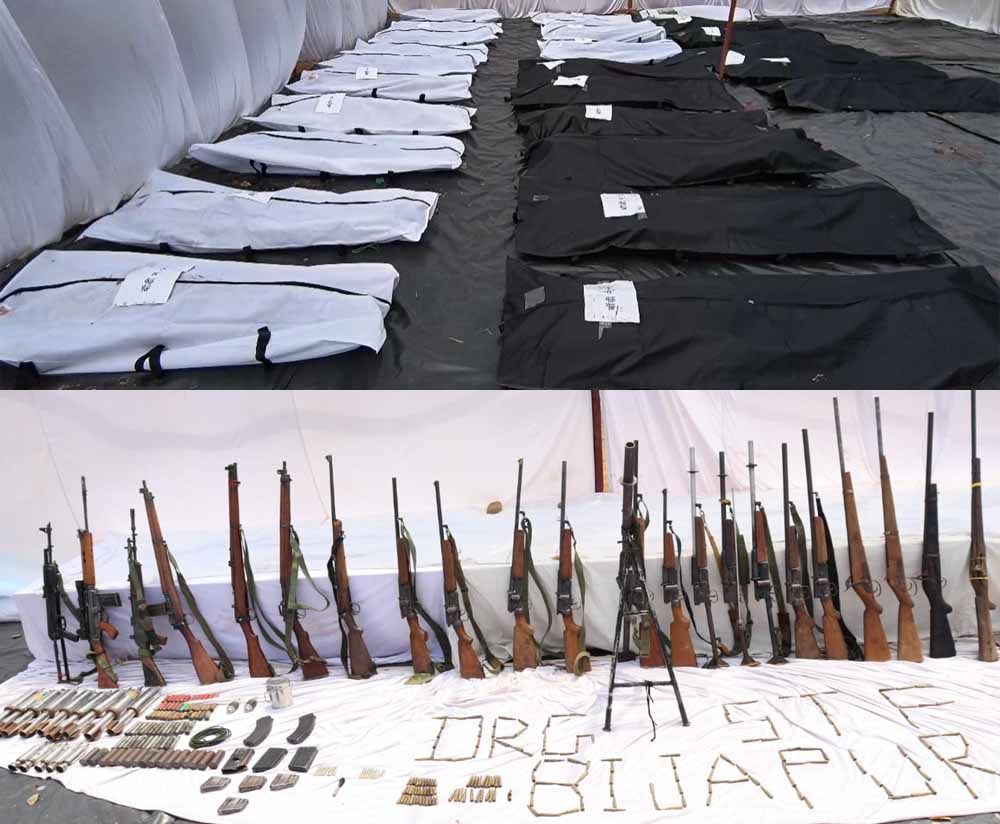 छत्तीसगढ़ के बीजापुर जिले के गंगालूर थाना क्षेत्र के जंगलों में गुरुवार को हुई मुठभेड़ में 14 महिला माओवादियों सहित कुल 26 वर्दीधारी माओवादी मारे गए. इस मुठभेड़ में डीआरजी बीजापुर के एक आरक्षक राजूराम ओयाम भी शहीद हो गए. मुठभेड़ के बाद घटनास्थल से भारी मात्रा में हथियार, विस्फोटक और माओवादी सामग्री बरामद की गई. वहीं आज नक्सलियों के शव को लेकर जवान बीजापुर जिला मुख्यालय पहुंचे. मारे गए 18 माओवादियों की शिनाख्त हो गई है, इन सभी पर 93 लाख रुपये का इनाम घोषित था. शेष मारे गये माओवादियों की पहचान की जा रही है.