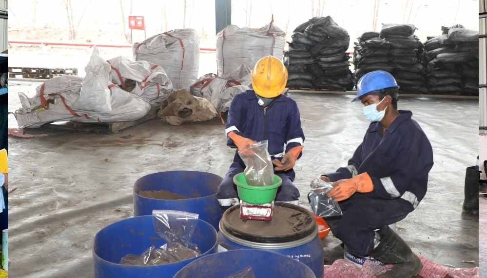रासायनिक कचरे को भस्मक में डालने से पहले छोटे-छोटे पैकेट बनाए जा रहे हैं।