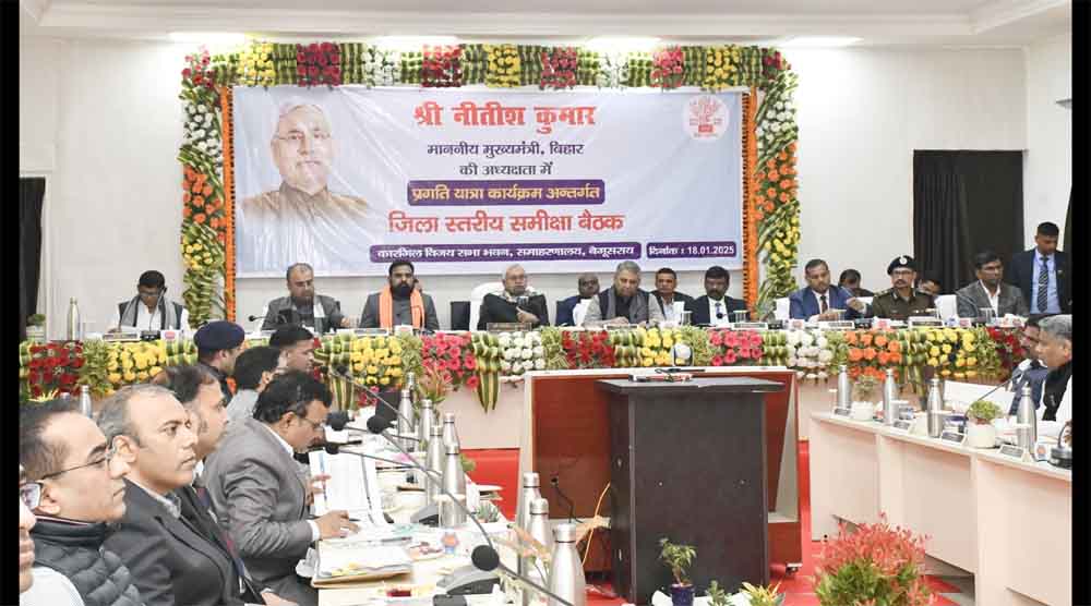 मुख्यमंत्री श्री नीतीश कुमार ने आज प्रगति यात्रा के तीसरे चरण में बेगूसराय जिले में चल रही विकासात्मक योजनाओं के संबंध में समाहरणालय स्थित कारगिल विजय सभा भवन में समीक्षात्मक बैठक की। समीक्षात्मक बैठक में बेगूसराय के जिलाधिकारी श्री तुषार सिंगला ने जिले के विकासकार्यों का प्रस्तुतीकरण के माध्यम से विस्तृत जानकारी दी।