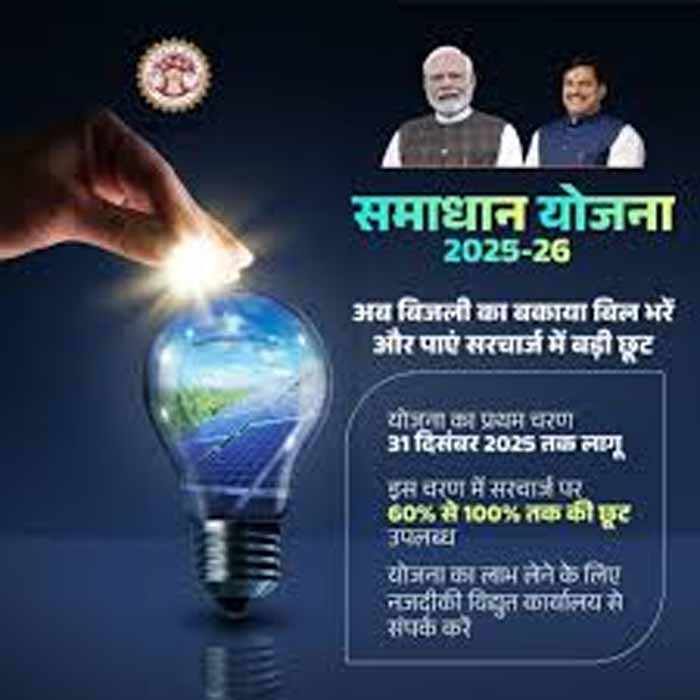 समाधान योजना 2025-26 का उद्देश्य 3 माह से अधिक अवधि के उपभोक्ताओं को बकाया विलंबित भुगतान के सरचार्ज पर छूट प्रदान करना है। यह योजना जल्दी आएं, एकमुश्‍त भुगतान कर ज्यादा लाभ पाएं के सिद्धांत पर आधारित है। इस योजना में उपभोक्ता को प्रथम चरण में एकमुश्‍त भुगतान करने पर सबसे अधिक लाभ होगा जबकि द्वितीय चरण के दौरान छूट का प्रतिशत क्रमशः कम होता जाएगा। यह योजना दो चरणों में प्रारंभ होकर प्रथम चरण की शुरुआत 3 नवंबर से 31 दिसंबर 2025 तक रहेगी, जिसमें 60 से लेकर 100 प्रतिशत तक सरचार्ज माफ किया जाएगा। इसी तरह द्वितीय और अंतिम चरण में जो कि एक जनवरी से 28 फरवरी 2026 तक लागू रहेगी, इसमें 50 से 90 फ़ीसदी तक सरचार्ज माफ किया जाएगा। प्रथम चरण में एकमुश्‍त राशि जमा कराने पर अधिकतम लाभ होगा। समाधान योजना 2025-26 का लाभ उठाने के लिए उपभोक्ताओं को म.प्र. मध्‍य क्षेत्र विद्युत वितरण कंपनी भोपाल हेतु portal.mpcz.in पर पंजीयन कराना होगा। कंपनी के उपाय एप एवं कॉमन सर्विस सेंटर (सीएससी) तथा एमपी ऑनलाइन पर भी पंजीयन की सुविधा उपलब्‍ध है। पंजीयन के दौरान अलग-अलग उपभोक्ता श्रेणी के लिए पंजीयन राशि निर्धारित की गई है। घरेलू एवं कृषि उपभोक्ता कुल बकाया राशि का 10 प्रतिशत तथा गैर घरेलू और औद्योगिक उपभोक्ता कुल बकाया राशि का 25 प्रतिशत भुगतान कर पंजीयन कराकर योजना में शामिल होकर लाभ उठा सकते हैं। विस्तृत विवरण तीनों कंपनियों की वेबसाइटों पर भी देखा जा सकता है साथ ही विद्युत वितरण केंद्र में पहुंचकर भी योजना के संबंध में जानकारी ले सकते हैं।