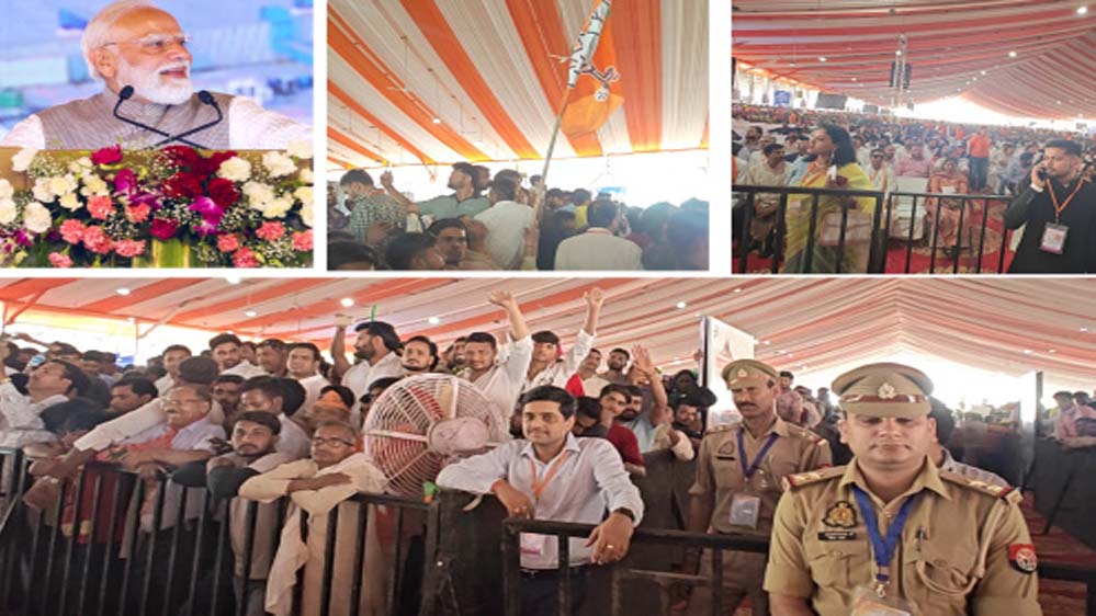 जैसे ही पीएम मोदी के साथ सीएम योगी मंच पर पहुंचे, पूरा परिसर अपार जनसमूह की तालियों और नारों से गुंजायमान हो उठा। युवाओं व महिलाओं के हाथों में प्रधानमंत्री मोदी और मुख्यमंत्री योगी आदित्यनाथ की तस्वीरों वाले पोस्टर लहरा रहे थे। भारी संख्या में लोग राष्ट्रीय ध्वज लेकर भी पहुंचे थे। पीएम और सीएम की तस्वीरों के कटआउट जनसभा को जीवंत बना रहे थे। प्रधानमंत्री मोदी के आह्वान पर पंडाल में हजारों मोबाइल फोन की फ्लैश लाइट मानो उत्तर प्रदेश के चमकते भविष्य की झलक दिखा रही थी।