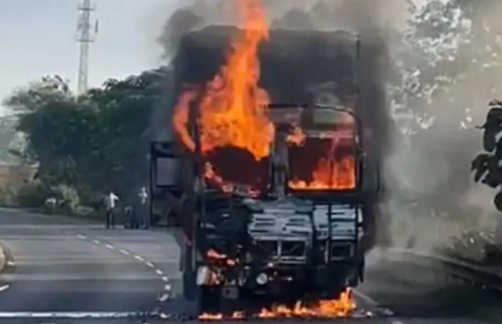 नेशनल हाईवे 44 पर अचानक जलने लगा ट्रक, ड्राइवर और हेल्पर ने कूदकर बचाई जान, देर से पहुंची फायर ब्रिगेड
