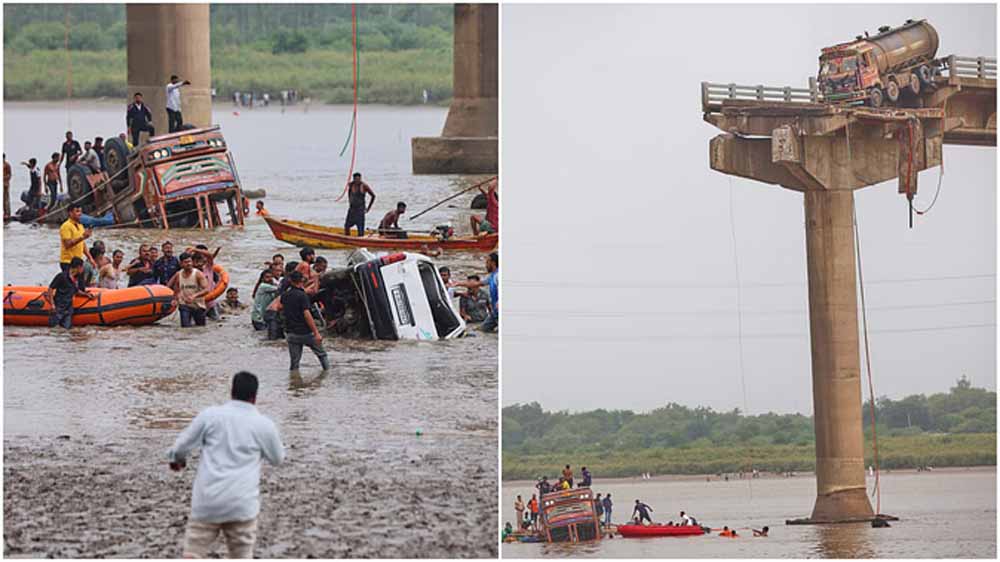 इससे पहले बुधवार सुबह वडोदरा के पादरा कस्बे के पास गंभीरा गांव के पास आणंद और वडोदरा जिलों को जोड़ने वाले चार दशक पुराने पुल का एक हिस्सा ढह जाने से कई वाहन महिसागर नदी में गिर गए थे। वडोदरा जिले के पुलिस अधीक्षक रोहन आनंद ने दिन में बताया, 'अब तक 16 शव बरामद किए जा चुके हैं, जबकि तीन से चार लोग अभी भी लापता हैं। तलाशी और बचाव अभियान अभी भी जारी है।'