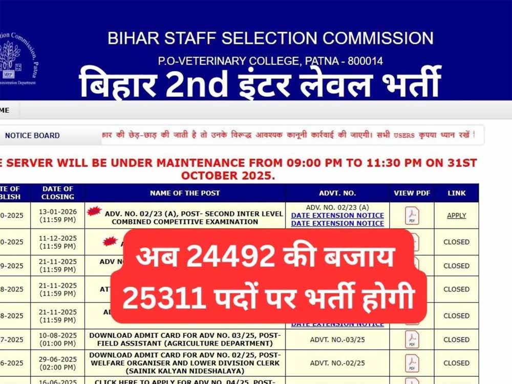बिहार कर्मचारी चयन आयोग की बीएसएससी सेकेंड इंटर लेवल भर्ती 2023 के लिए आवेदन की आज लास्ट डेट है। इस भर्ती के तहत 25311 पदों पर भर्ती होगी। रजिस्ट्रेशन करने व फीस जमा कराने की अंतिम तिथि आज 13 फरवरी 2026 है। फॉर्म भरकर पूरी तरह सब्मिट करने की अंतिम तिथि 16 फरवरी 2026 कर दी गई है। आपको बता दें कि यह भर्ती 2023 में निकली थी। तब से इस भर्ती में कई बार पद बढ़ चुके हैं। आवेदन की अंतिम तिथि भी कई बार बढ़ाई जा चुकी है। इस भर्ती में करीब 33 लाख से ज्यादा आवेदन आ चुके हैं। बार बार आवेदन की तिथि बढ़ाए जाने से परीक्षा तिथि का इंतजार कर रहे लाखों अभ्यर्थी भड़क गए हैं। उनका कहना है कि बार बार फॉर्म रीओपन करके डेट बढ़ाई जा रही है। इस भर्ती का सरकार ने मजाक बना दिया है। आपको बता दें कि पहली इंटरस्तरीय परीक्षा के लिए 2014 में विज्ञापन निकाला था। इसका फाइनल रिजल्ट सात साल में पूरा हुआ था।