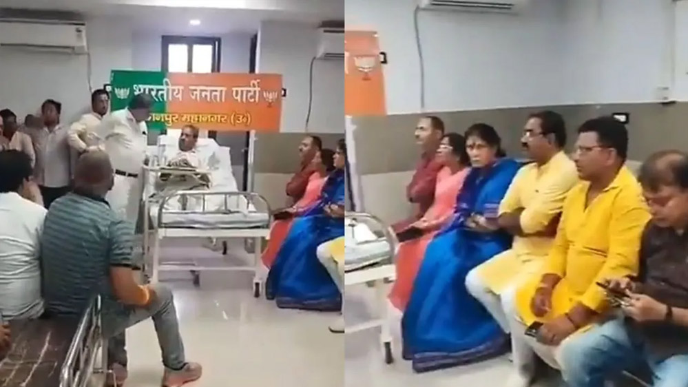 बीजेपी नेता का टूटा पैर तो अस्पताल को बना दिया पार्टी दफ्तर, बेड के पीछे पोस्टर लगाकर हुई मीटिंग