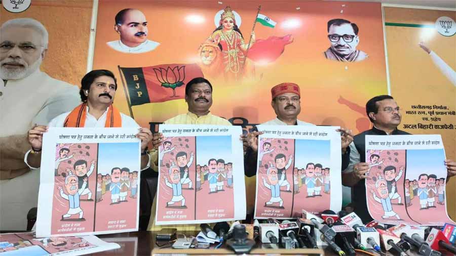 भाजपा कार्यालय एकात्म परिसर में आज भाजपा ने कांग्रेस के खिलाफ एक पोस्टर भी जारी किया. इसके एक हिस्से में पूर्व सीएम भूपेश बघेल और दीपक बैज नजर आ रहे हैं. जिसके निचे लिखा है कि कांग्रेस ने कार्यकर्ताओं से मांगा सुझाव. वहीं दूसरी ओर सीएम साय समेत भाजपा के नेता लोगों के बीच सुझाव मांग रहे हैं. इसके निचे लिखा है कि भाजपा ने जनता से मांगा सुझाव.
