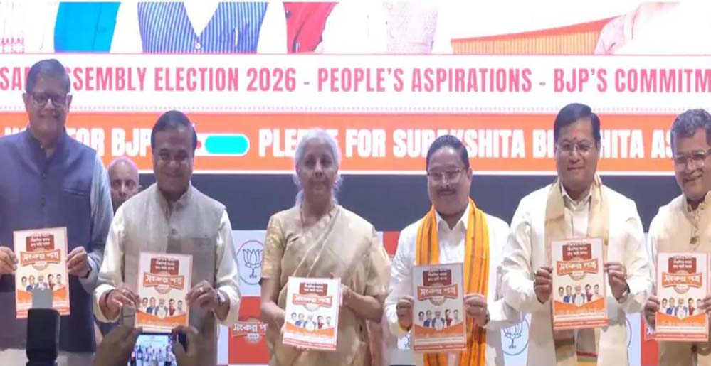 गुवाहाटी स्थित असम बीजेपी के कार्यालय में आयोजित कार्यक्रम में जारी घोषणापत्र को पार्टी ने संकल्प पत्र नाम दिया है. मुख्यमंत्री हिमंत बिस्वा सरमा और असम बीजेपी के अध्यक्ष दिलीप सैकिया के साथ केंद्र की मोदी सरकार में वित्त मंत्री निर्मला सीतारमण ने यह घोषणापत्र जारी किया. बीजेपी ने असम में समान नागरिक संहिता (यूसीसी) लागू करने, दो लाख नौकरियां देने का भी वादा किया है।