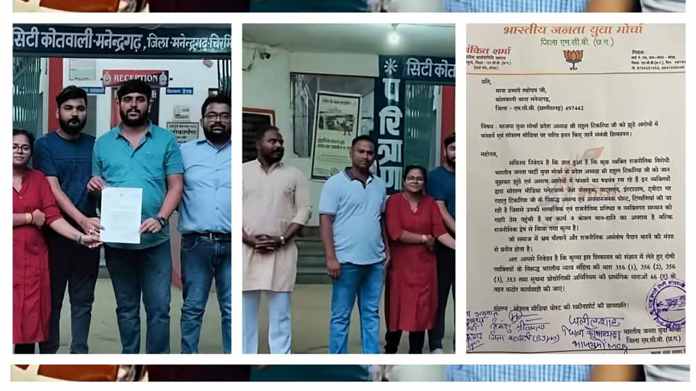भारतीय जनता युवा मोर्चा (भाजयुमो) ने प्रदेश अध्यक्ष राहुल योगराज टिकरिहा के खिलाफ सोशल मीडिया पर फैलाई जा रही झूठी, भ्रामक और सुनियोजित अफवाहों के खिलाफ मोर्चा खोल दिया है। भाजयुमो पदाधिकारियों और कार्यकर्ताओं ने सिटी कोतवाली मनेंद्रगढ़ में पहुंचकर थाना प्रभारी सुनील तिवारी को एफआईआर हेतु आवेदन सौंपते हुए अफवाह फैलाने वालों पर कड़ी कार्रवाई की मांग की।