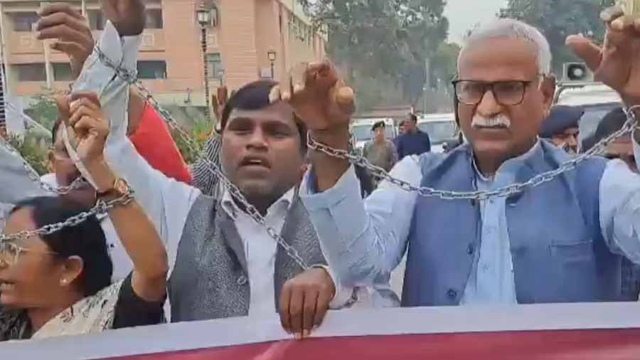वाम दल के विधायक हाथ में हथकड़ी लगाकर प्रदर्शन करते नजर आ रहे हैं. उन्होंने कहा कि, इस मामले पर सदन में जवाब देना होगा. सरकार बताए कि किस तरह से भारतीय मजदूर को अमेरिका हथकड़ी लगाकर देश भेज रहा है? अमेरिका के सामने भारत चुप क्यों है? निश्चित तौर पर इसका जवाब सरकार को देना होगा. हाथ में हथकड़ी पहनकर विधान सभा में प्रदर्शन कर रहे वाम दल के विधायको की मांग है की बिहार के सदन ऐसे मामले पर निंदा प्रस्ताव पारित कर भेजा जाए.