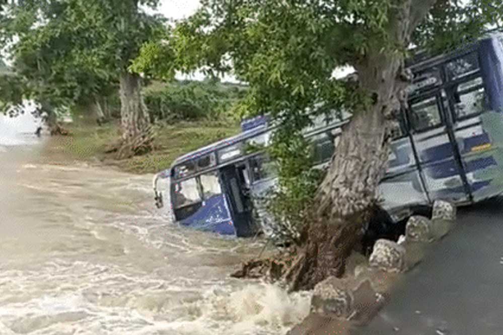 दमोह में अनियंत्रित हुई बस, उफनते नाले से गुजरते वक्त पुलिया से लटकी