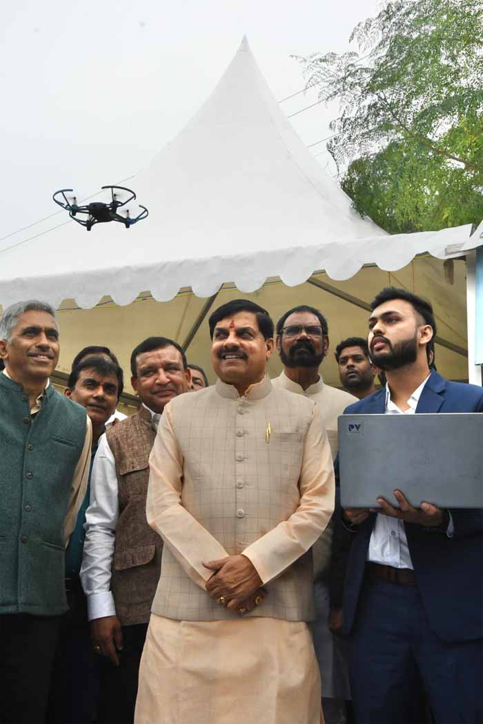 मुख्यमंत्री डॉ. यादव ने इस अवसर पर लगाई गई प्रदर्शनी और वर्कशॉप का शुभारंभ कर अवलोकन किया। मुख्यमंत्री डॉ. यादव ने विभिन्न शैक्षणिक संस्थाओं, स्टार्टअप और औद्योगिक संस्थानों द्वारा लगाए गए स्टॉल्स पर पहुंचकर ड्रोन तकनीक के शैक्षणिक, औद्योगिक और कृषि क्षेत्र में उपयोग के संबंध में जानकारी प्राप्त की। मुख्यमंत्री डॉ. यादव ने कहा कि ड्रोन टेक एक्सपो वर्कशॉप का आयोजन भारत की तकनीकी क्रांति का प्रतीक है। किसान भाइयों के लिए ड्रोन वरदान बन गया है। आपदा कीस्थिति हो या पुलिस प्रशासन के लिए मॉनीटरिंग की आवश्यकता ड्रोन तकनीक ने जीवन के विभिन्न क्षेत्रों में जिस प्रकार से बदलाव किया है वह अभूतपूर्व है। राज्य सरकार विकास-नवाचार और आत्मनिर्भरता के सशक्त वाहक के रूप में ड्रोन तकनीक का उपयोग करने के पथ पर अग्रसर है।