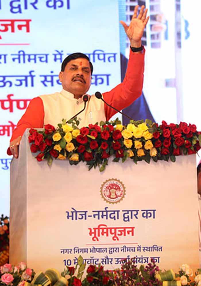 मुख्यमंत्री डॉ. मोहन यादव ने राजधानी भोपाल के समीप स्थित समरधा में "भोज-नर्मदा द्वार" का भूमिपूजन कर प्रदेश की सांस्कृतिक और ऐतिहासिक विरासत को साकार रूप देने की दिशा में एक और पहल की। इस अवसर पर उन्होंने भोपाल नगर निगम द्वारा नीमच में स्थापित 10 मेगावॉट की सौर ऊर्जा परियोजना का वर्चुअल लोकार्पण भी किया।