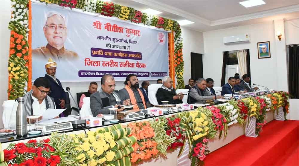 मुख्यमंत्री श्री नीतीश कुमार ने आज प्रगति यात्रा के तीसरे चरण में बेगूसराय जिले में चल रही विकासात्मक योजनाओं के संबंध में समाहरणालय स्थित कारगिल विजय सभा भवन में समीक्षात्मक बैठक की।समीक्षात्मक बैठक में बेगूसराय के जिलाधिकारी श्री तुषार सिंगला ने जिले के विकासकार्यों का प्रस्तुतीकरण के माध्यम से विस्तृत जानकारी दी।