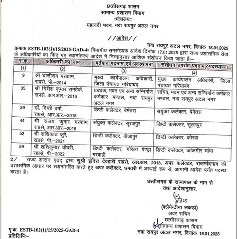 जिला पंचायत CEO मरकाम को हटाया, छत्तीसगढ़-गरियाबंद कलेक्टर ने ऋषा ठाकुर को बनाया रिटर्निंग ऑफिसर