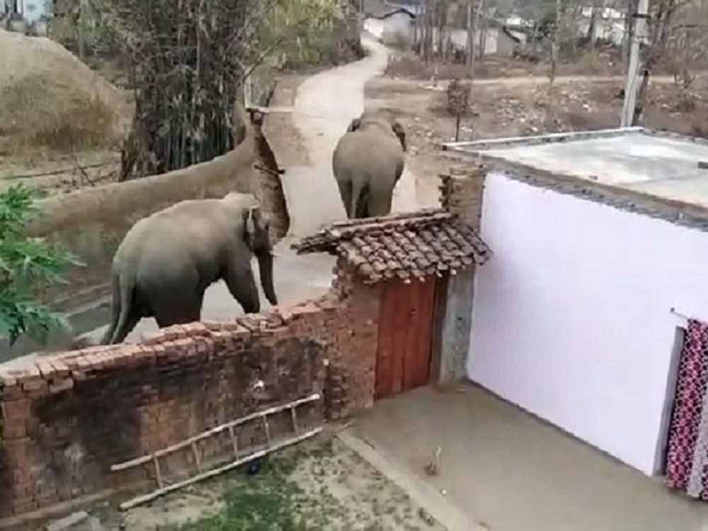हाथी हर्री गांव में घुस गए थे,जहां चार कच्चे मकानों में तोड़फोड़ करते हुए अंदर रखा अनाज खाया