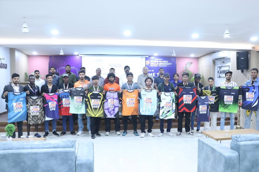 स्कोप ग्लोबल स्किल्स यूनिवर्सिटी के फुटसल अरेना का भव्य शुभारंभ 21 मार्च को स्कोप फुटसल लीग के आगाज के साथ किया जाएगा। यह रोमांचक टूर्नामेंट 21 से 24 मार्च तक विश्वविद्यालय परिसर में हाल ही में निर्मित फुटसल अरेना में आयोजित किया जाएगा। इस अवसर पर आज स्कोप फुटसल लीग में भाग लेने वाली क्लब टीमों की आधिकारिक जर्सी लॉन्च की गई। जर्सी लॉन्चिंग कार्यक्रम में विश्वविद्यालय के कुलपति डॉ. विजय सिंह, कुलसचिव डॉ. सितेश सिन्हा और मुख्य वित्त लेखा अधिकारी श्री विनीत शुक्ला ने संयुक्त रूप से क्लब टीमों की जर्सी लॉन्च की। इस दौरान सभी क्लब टीमों के कैप्टेन्स भी उपस्थित रहे।