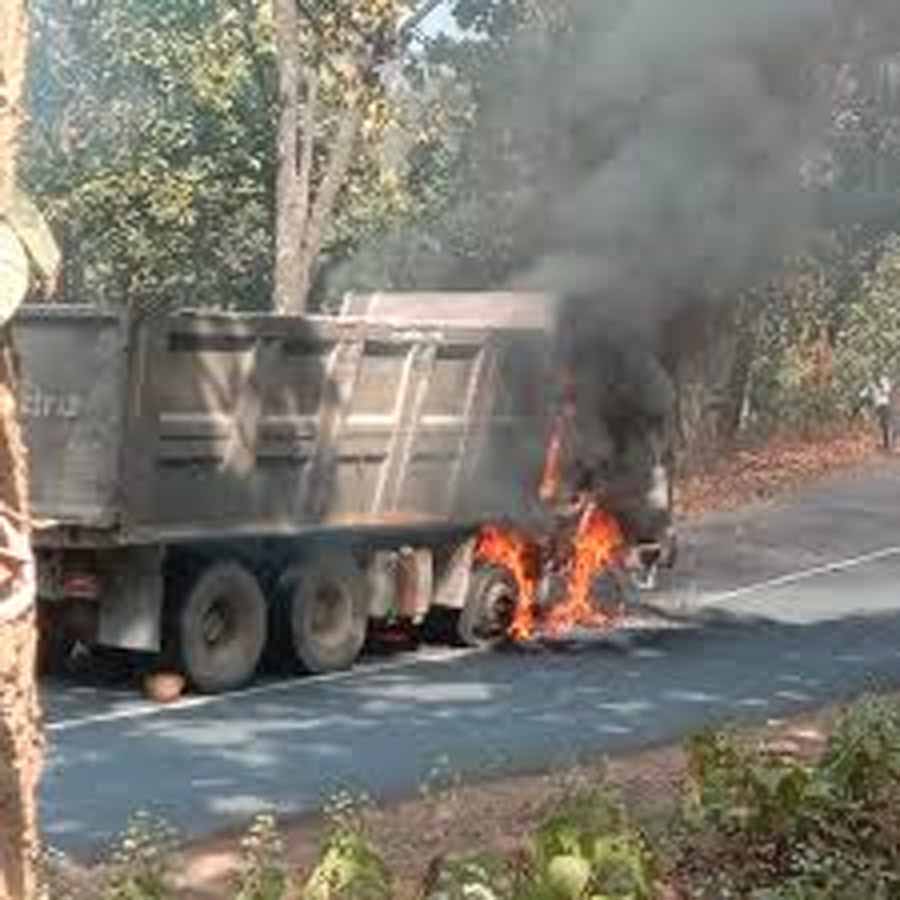 चलती हाइवा में लगी आग, चालक-परिचालक ने वाहन से कूदकर बचाई जान, आवागमन बाधित
