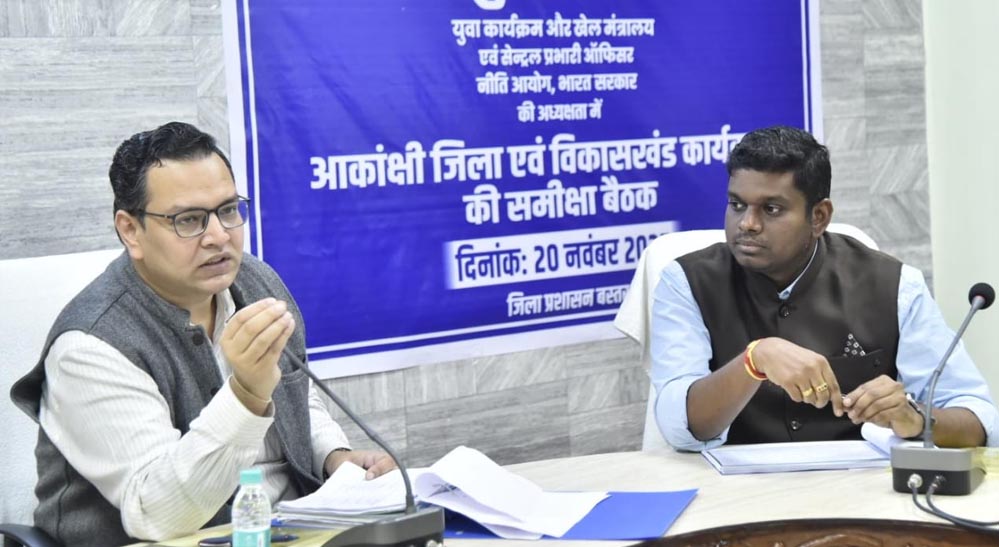 नीति आयोग द्वारा नियुक्त बस्तर जिले के नोडल अधिकारी एवं संयुक्त सचिव  शोभित जैन ने बस्तर आकांक्षी जिला और ब्लॉक कार्यक्रमों की प्रगति की समीक्षा बैठक जिला कार्यालय के आस्था सभाकक्ष में ली। बैठक में  कलेक्टर  हरिस एस ने जिले और ब्लॉक में आकांक्षी कार्यक्रम के अंतर्गत योजनाओं के क्रियान्वयन के संबंध में विस्तृत जानकारी दी और समस्याओं के संबंध में भी अवगत करवाया।