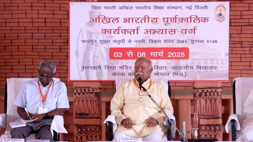 राष्ट्रीय स्वयंसेवक संघ के सर संघचालक मोहन भागवत ने मंगलवार को मध्य प्रदेश की राजधानी भोपाल में विद्याभारती अखिल भारतीय शिक्षा संस्थान के पूर्णकालिक कार्यकर्ताओं के पांच दिवसीय प्रशिक्षण शिविर का औपचारिक उद्घाटन किया है। बता दें कि ये शिविर भोपाल के सरस्वती विद्या मंदिर आवासीय विद्यालय, शारदा विहार में आयोजित किया जा रहा है। अभ्यास वर्ग में देश भर के 700 से ज्यादा पूर्ण कालिक कार्यकर्ता शामिल हुए हैं।