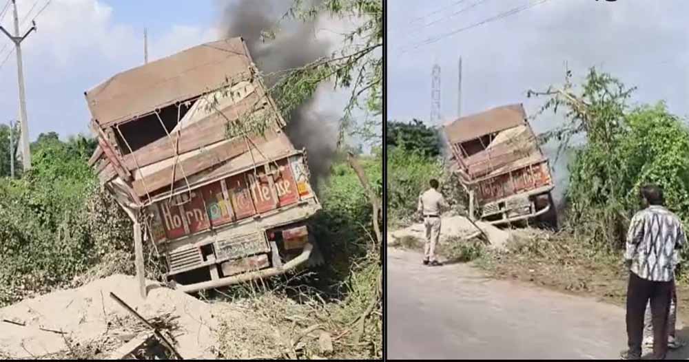 टक्कर के बाद पलटा ट्रक, बाइक सवार दबकर जिंदा जले
