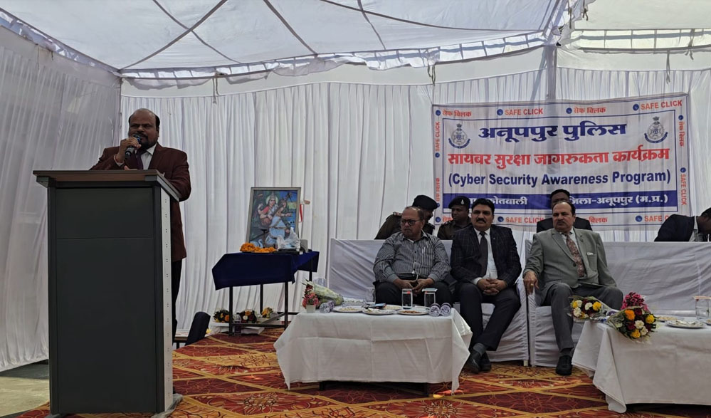 पुलिस मुख्यालय, भोपाल  के निर्देश पर पुलिस अधीक्षक अनूपपुर श्री मोती उर रहमान जी के द्वारा सायबर क्राईम सुरक्षा जागरूकता हेतु चलाये जा रहे सेफ क्लिक अभियान के अंतर्गत शुक्रवार की सुबह माननीय प्रधान जिला एवं सत्र न्यायाधीश महोदय अनूपपुर श्रीमान पी.सी. गुप्ता, माननीय प्रधान न्यायाधीश कुटुम्ब न्यायालय अनूपपुर श्री मनोज कुमार लाढिया, माननीय द्वितीय जिला एवं अपर सत्र न्यायाधीश अनूपपुर श्री नरेन्द्र पटेल, माननीय मुख्य न्यायिक मजिस्ट्रेट अनूपपुर श्रीमती चेनवती ताराम, माननीय न्यायिक मजिस्ट्रेट प्रथम श्रेणी अनूपपुर श्रीमती पारूल जैन, माननीय न्यायिक मजिस्ट्रेट अनूपपुर सुश्री सृष्टि साहू, जिला विधिक सहायता अधिकारी श्री दिलावर सिहं, प्राचार्य तुलसी महाविद्यालय श्री अनिल सक्सेना, श्रीमान अतिरिक्त पुलिस अधीक्षक महोदय श्री इसरार मन्सूरी, श्रीमान एस.डी.ओ.पी. महोदय अनूपपुर श्री सुमित केरकेट्टा की गरिमामय उपस्थिति में प्रधानमंत्री कालेज आफ एक्सीलेन्स तुलसी महाविद्यालय अनूपपुर में कोतवाली पुलिस अनूपपुर द्वारा करीब 300 छात्र - छात्राओं के बीच सायबर क्राईम सुरक्षा जागरूकता कार्यक्रम का आयोजन किया गया।