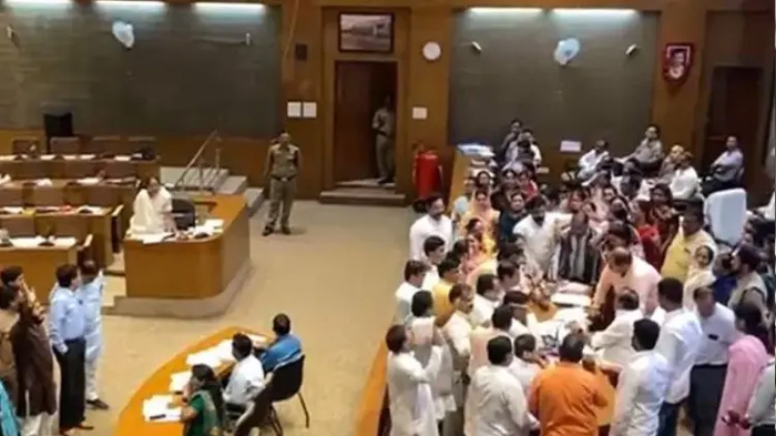 बैठक में महापौर मालती राय ने वन नेशन वन इलेक्शन का समर्थन प्रस्ताव रखा। भाजपा पार्षद सूर्यकांत गुप्ता ने इस पर चर्चा शुरू करनी चाही, लेकिन कांग्रेस पार्षदों ने विरोध जताया। उन्होंने कहा कि यह लोकसभा का मामला है, नगर निगम में इसे क्यों उठाया जा रहा है। इस पर निगम अध्यक्ष सूर्यवंशी ने कहा कि प्रस्ताव मेरी अनुमति से रखा गया है, सभी पार्षद अपनी सीटों पर बैठें। लेकिन कांग्रेस पार्षदों ने विरोध जारी रखा और अध्यक्ष की आसंदी के सामने पहुंच गए। अध्यक्ष ने कांग्रेस पार्षदों को वापस भेजा, वहीं भाजपा पार्षद सूर्यकांत गुप्ता ने प्रस्ताव रखना जारी रखा और भाजपा पार्षदों ने इसका समर्थन किया।