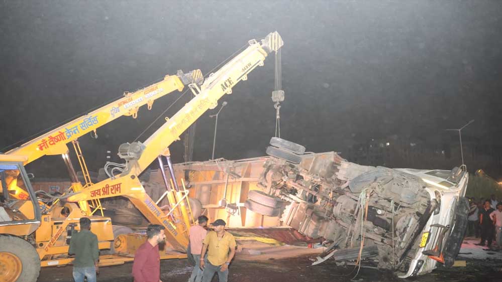 इंदौर : बायपास पर प्लास्टिक दाने से भरा ट्राला पलटा, ट्राले ने पहले एक बाइक सवार को चपेट में लिया