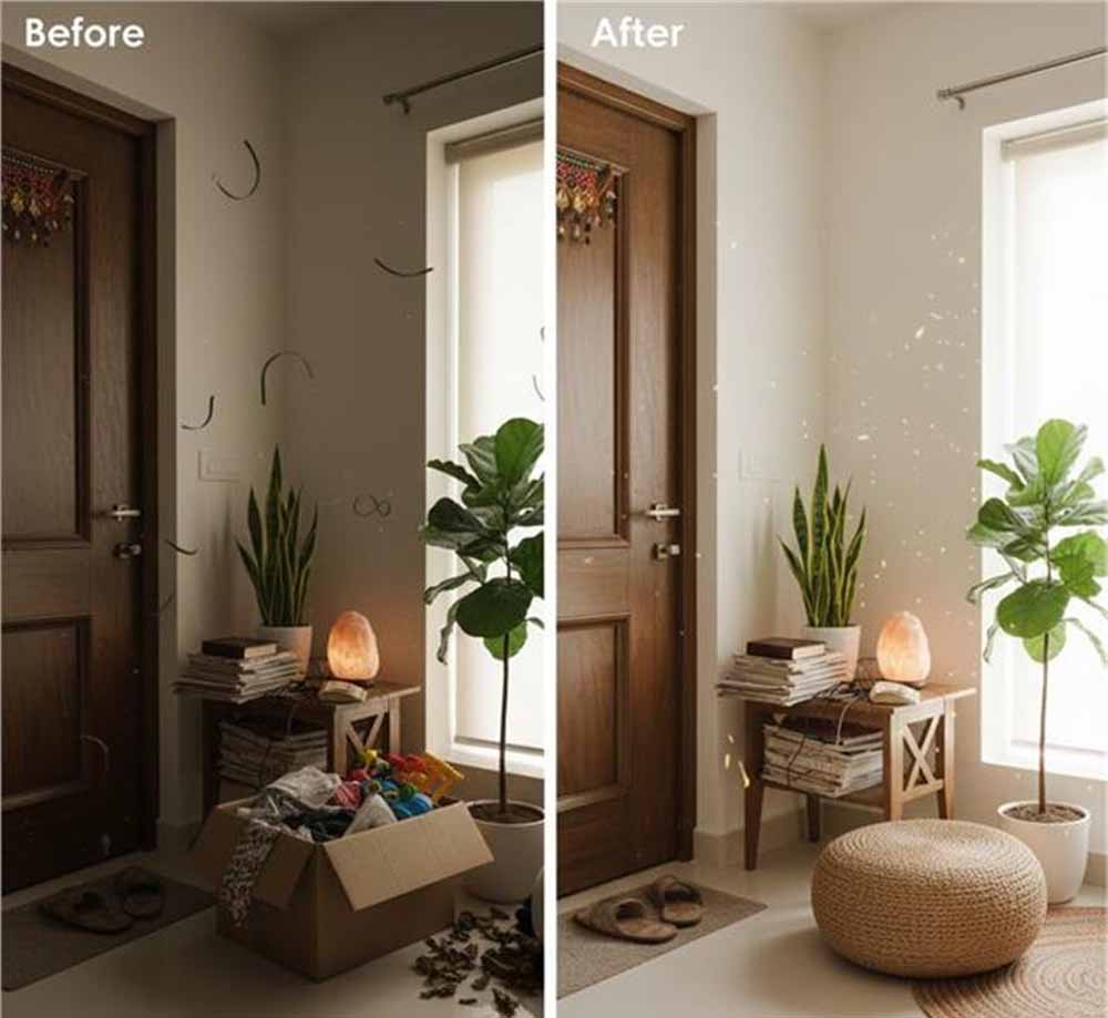 दरवाज़े के पास कभी भी टूटी हुई या बंद पड़ी वस्तुएं न रखें। यह अवसर और धन के प्रवेश में सीधे बाधा डालता है।