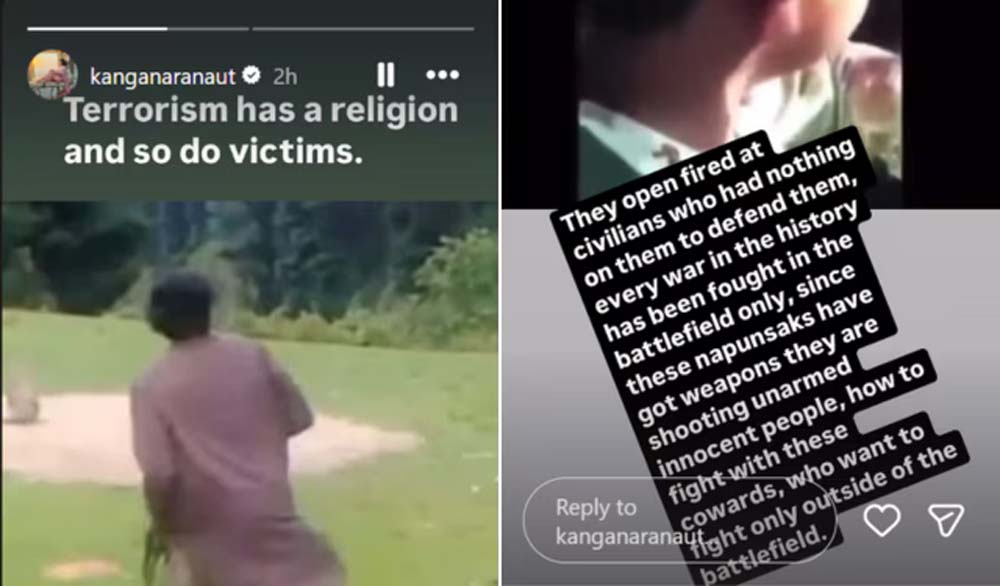 कंगना रनौत ने अपने इंस्टाग्राम पर दो पोस्ट शेयर किए। पहली पोस्ट में हमले की तस्वीर है। इस तस्वीर के साथ कंगना ने लिखा- "आतंकवाद का धर्म होता है और पीड़ितों का भी।" कंगना ने दूसरे पोस्ट में पीड़ितों का वीडियो शेयर किया है। इसे शेयर करने के साथ कंगना ने लिखा- "इन लोगों ने आम नागरिकों पर गोलियां बरसाईं जिनके पास खुद को बचाने के लिए कुछ भी नहीं था। इतिहास में हर लड़ाई जंग के मैदान में लड़ी गई है, लेकिन जब से इन नपुंसकों को हथियार मिले हैं ये मासूम लोगों पर गोलियां चला रहे हैं, इन डरपोक लोगों से कैसे लड़ा जाए जो केवल जंग के मैदान के बाहर लड़ना चाहते हैं।"
