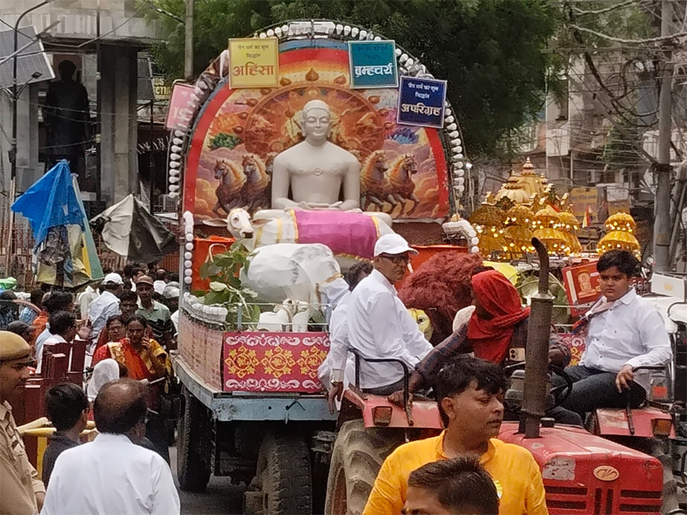 गाजे बाजे के साथ सजे रथ पर निकले भगवान महावीर अनुयायियों ने किया सुख शांति और विश्व कल्याण का आह्वान